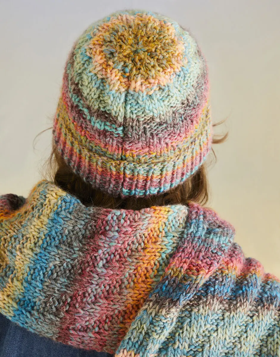 The Sea Breeze Hat & Scarf knitting pattern has a diagonal textured stitch design which contrasts with the horizontal stripes of Sirdar Jewelspun With Wool to create a sense of movement. The all-round rib prevents the scarf edges from curling. The knitting pattern for the matching beanie style hat features the same diagonal pattern with a rib turn-back.